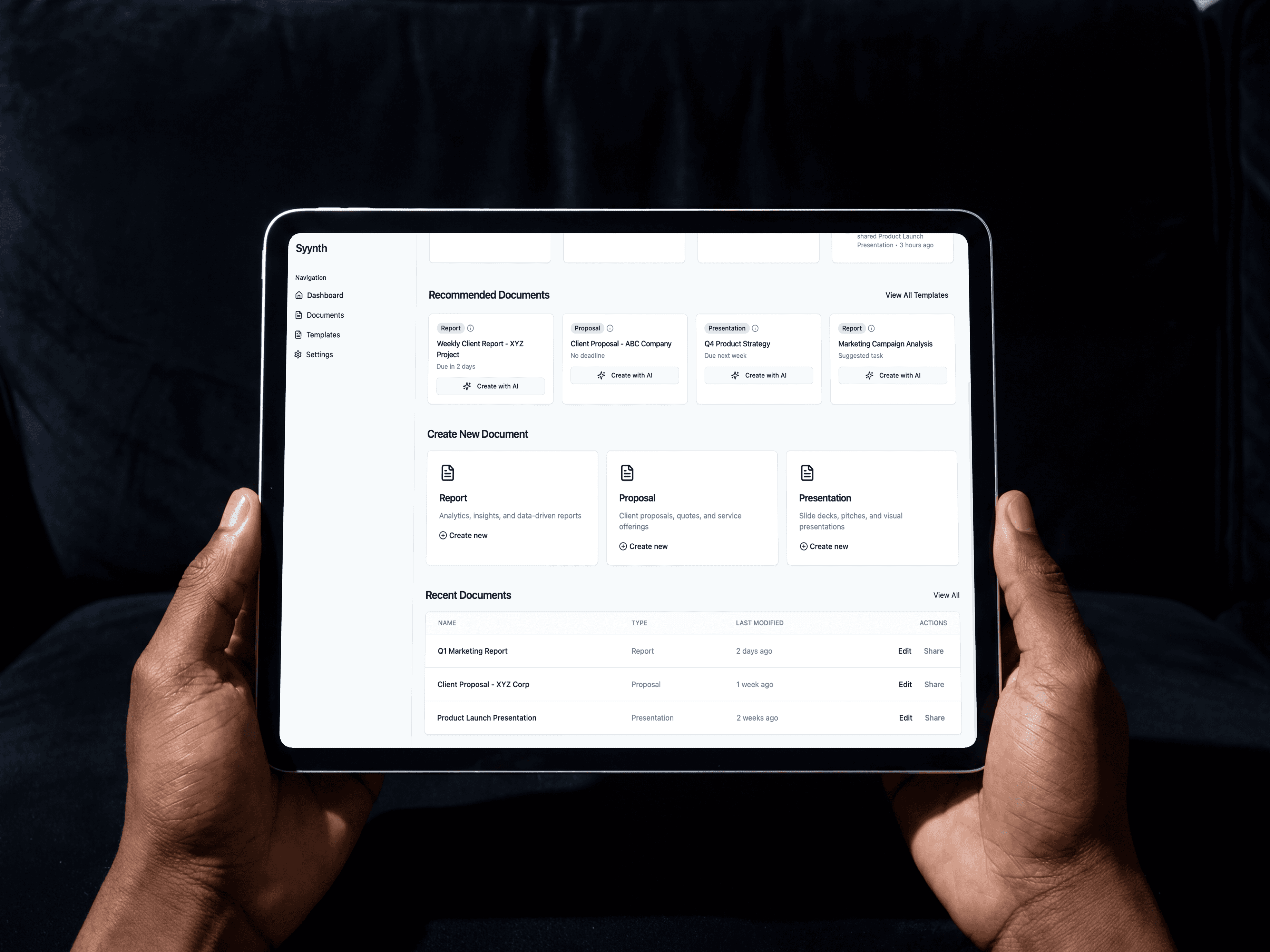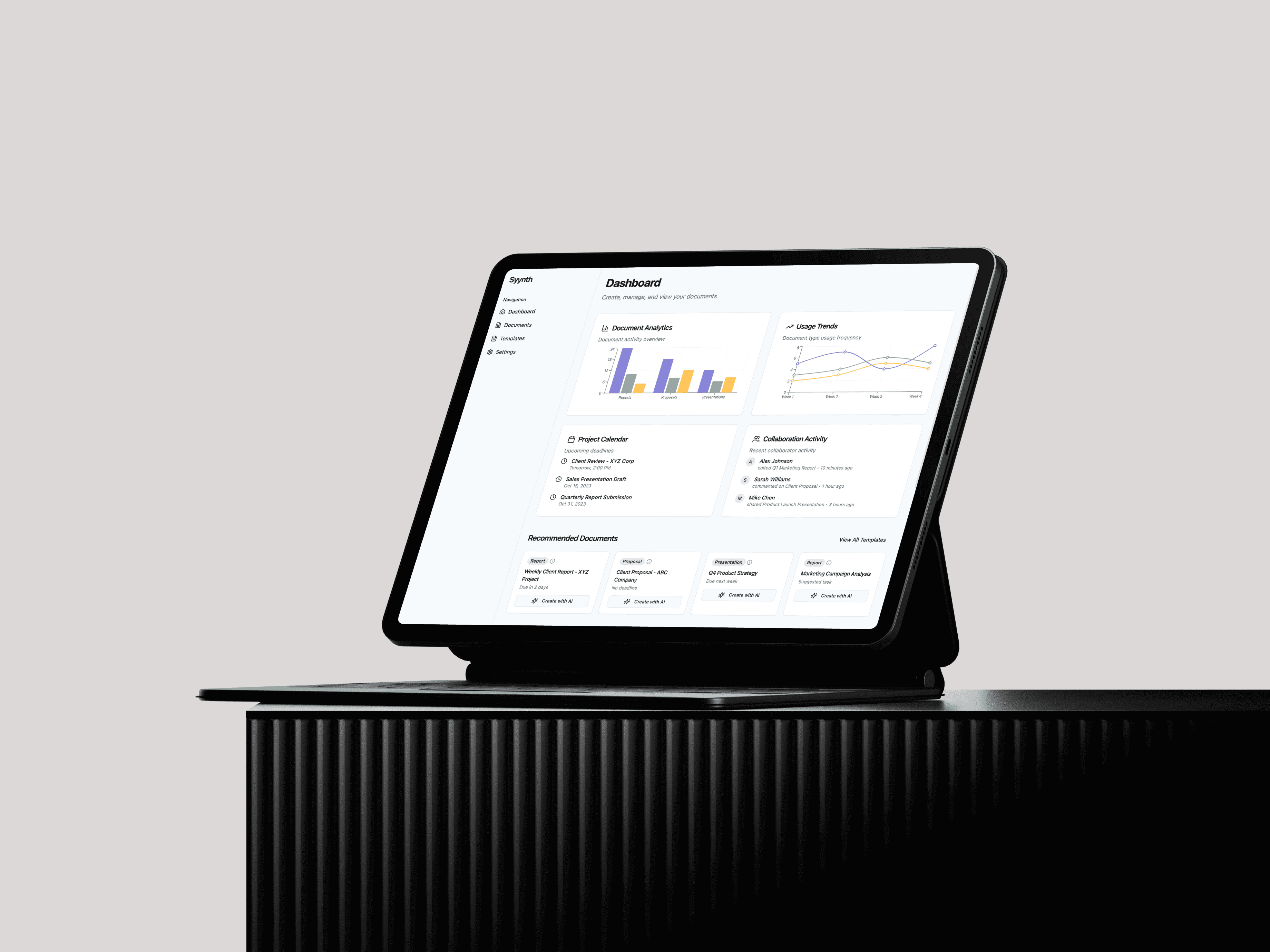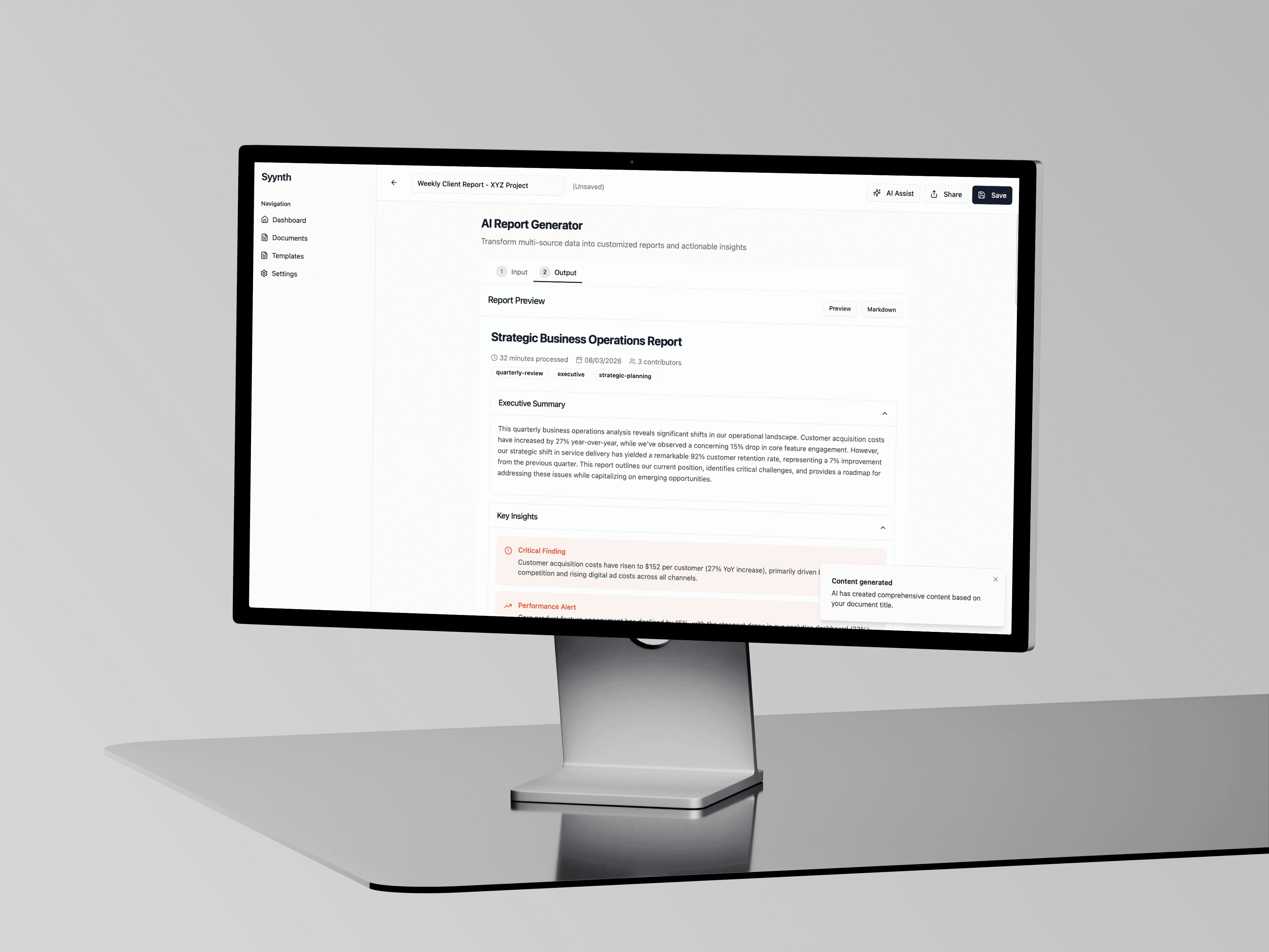 Syynth is an intelligent document generation and analytics platform designed for strategy and operations teams. By combining a macro-level analytics dashboard with a proactive AI authoring engine, the platform enables professionals to instantly transform raw business data into structured, highly formatted reports complete with automatically extracted, categorised insights.